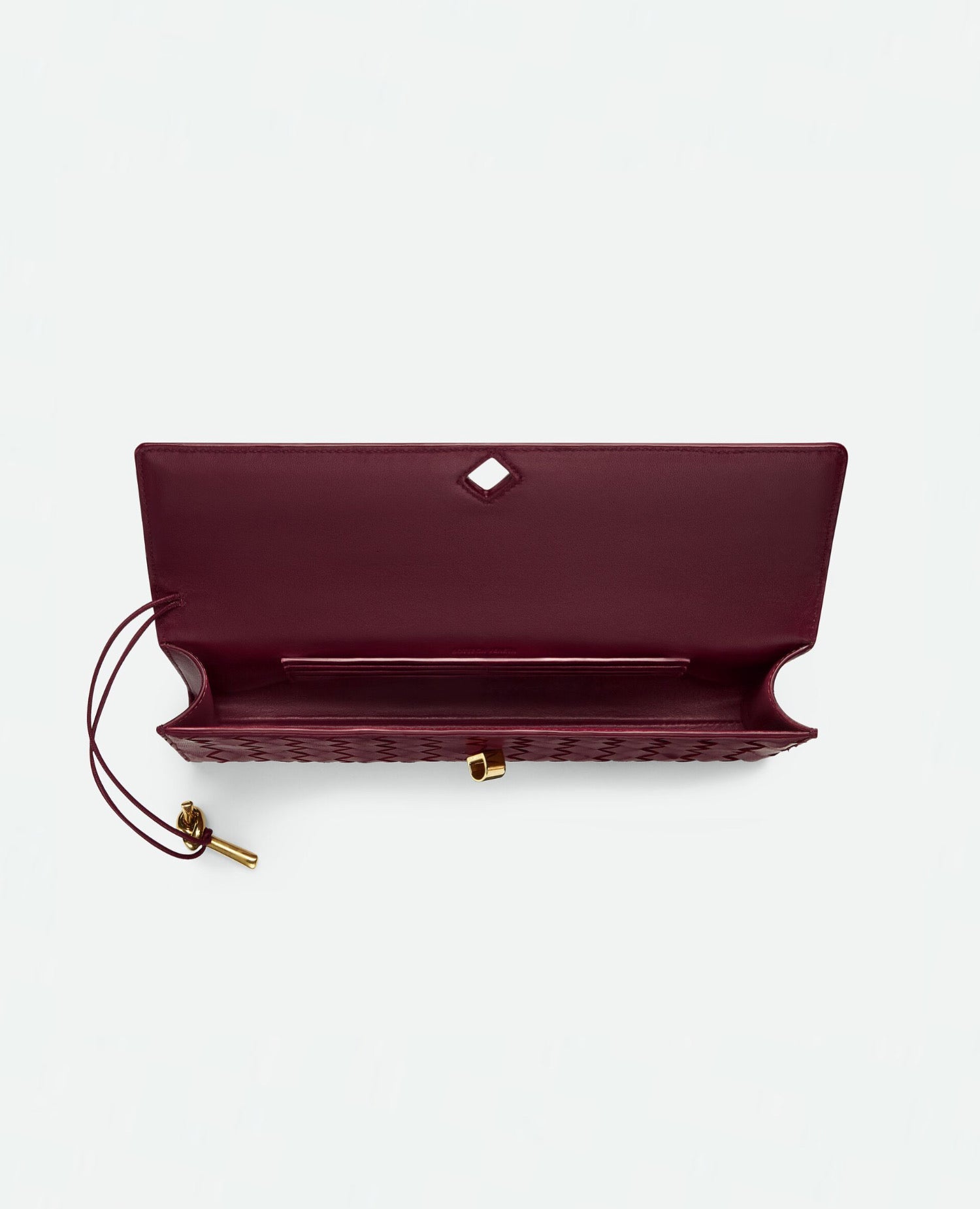 with an elongated silhouette and metallic knot closure.