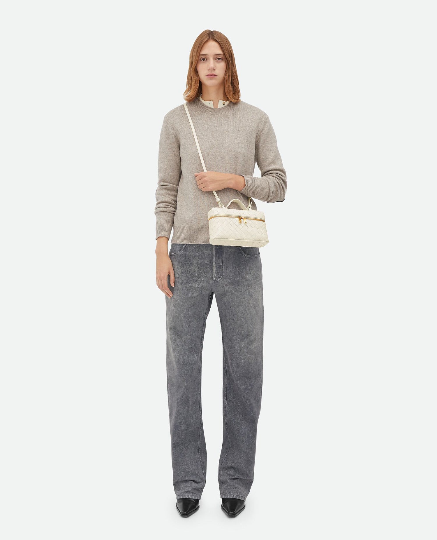 Intrecciato leather vanity case with detachable strap.