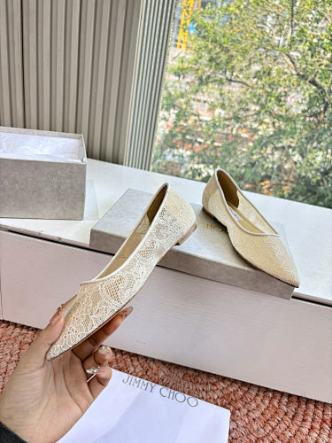 Embrace timeless elegance with these Jimmy Choo ballet flats, a sophisticated blend of delicate textures and premium craftsmanship. Crafted from exquisite floral lace and accented with varnished effect leather trims, these flats offer a refined, solid-color aesthetic that transitions seamlessly from day to evening. The sleek, narrow toeline provides a modern silhouette while maintaining the classic charm of a traditional ballerina shoe.