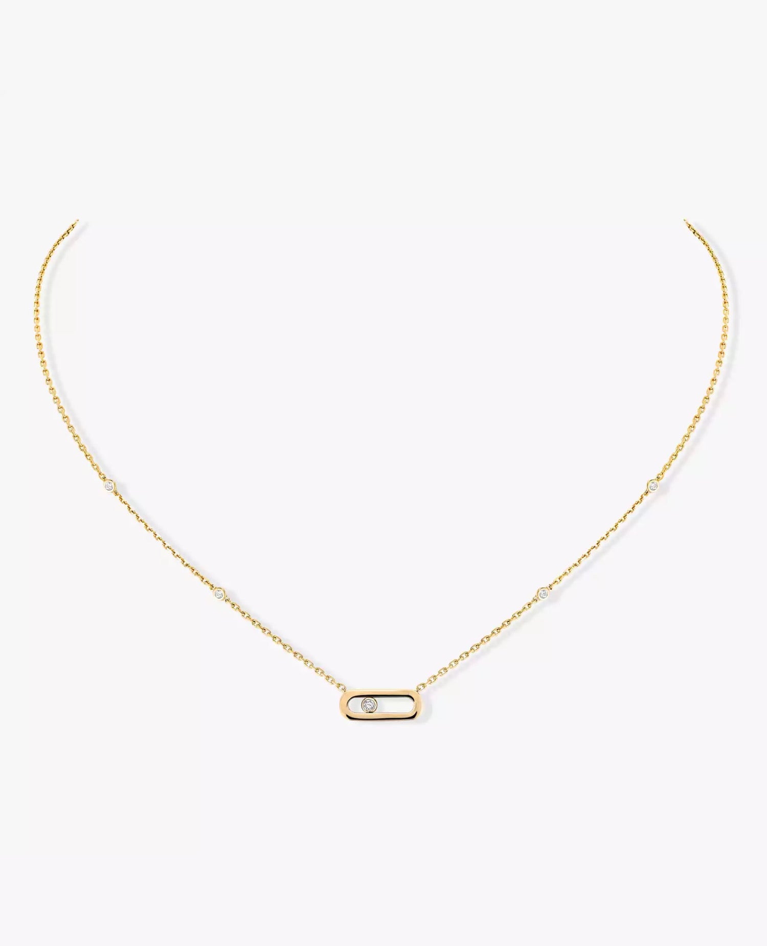 Looking for the perfect gift? The Move Uno diamond necklace in yellow gold is part of the Move collection from the Messika Jewelry and High Jewelry Maison. This iconic collection derives from the moving diamond that slides into its center. Created by hand in 18-carat white gold, we particularly like its adjustable chain set with five other diamonds for a radiant effect. Whether you go for a minimalist look by wearing this diamond necklace on its own, or a more fashionable look by layering it with other creations from the Maison, this women's jewelry piece will quickly become your everyday companion, to accessorise your neckline with a discreet and precious radiance.