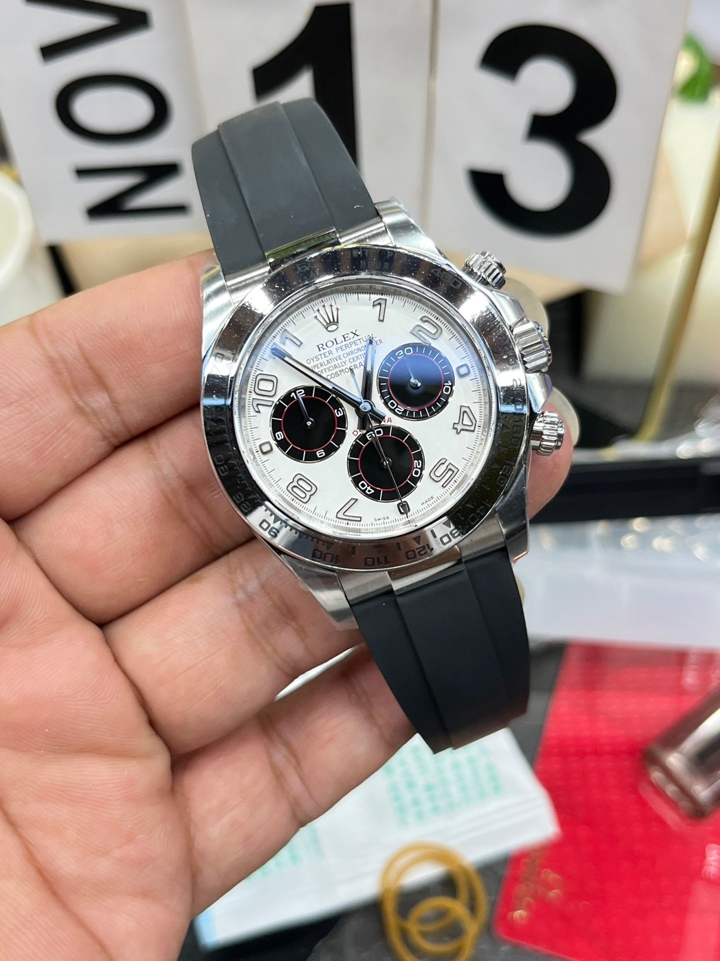 Dial: White Panda Racing Dial (White background with black sub-dials and Arabic numerals).