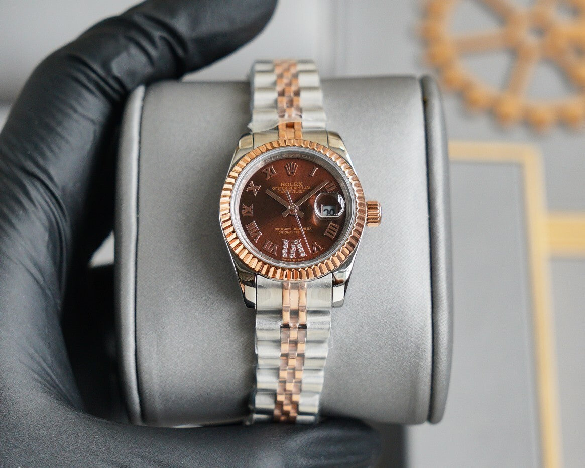 The classic watch for women, redesigned for a modern era. This Lady-Datejust 28 exudes grace with its "Everose Rolesor" composition—a perfect harmony of Oystersteel and 18 ct Everose gold. The deep chocolate dial adds a layer of richness, making it a sophisticated statement piece for the feminine wrist.